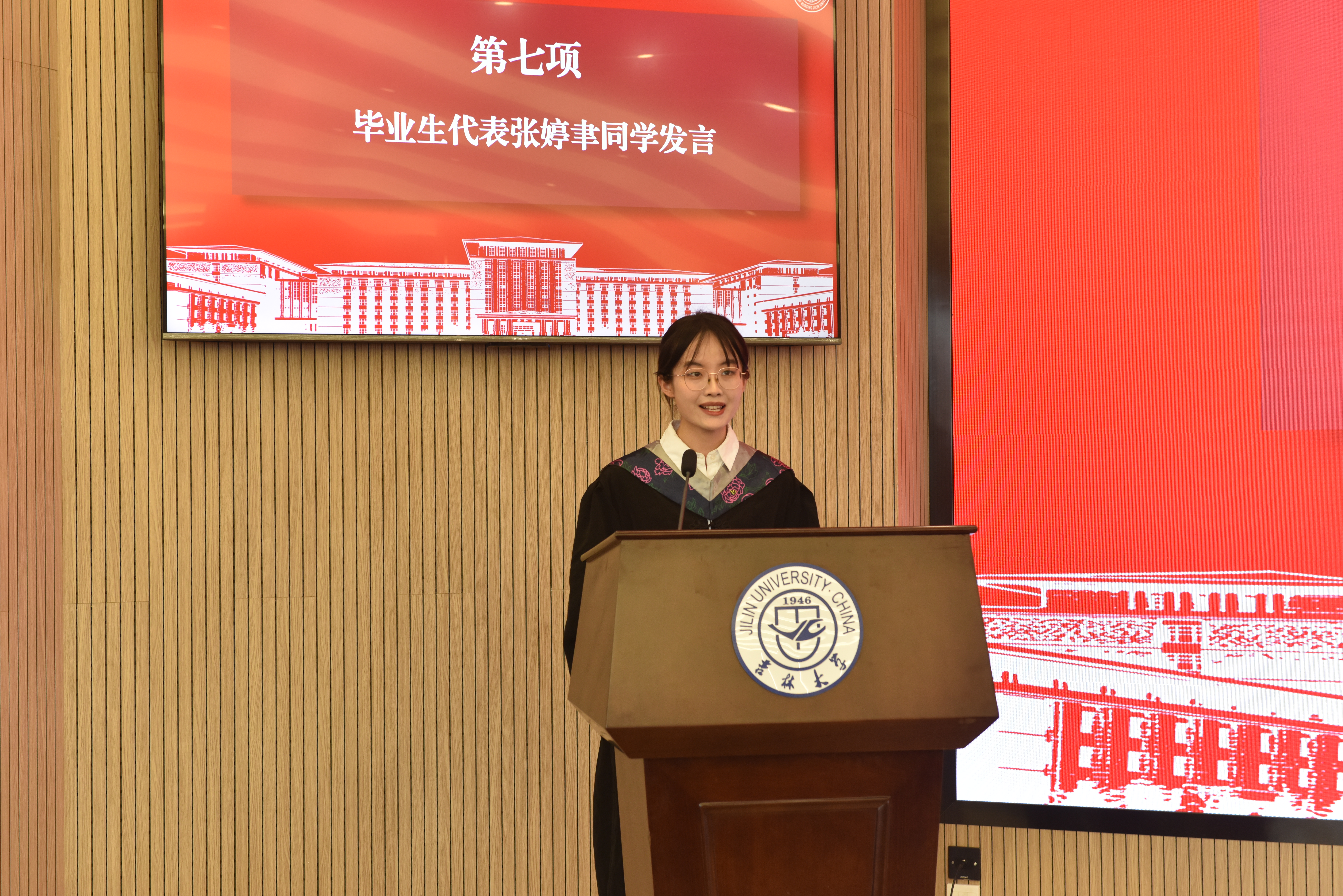 研究生毕业生代表马冬飞和本科毕业生代表张婷聿发言,深情回忆了学习生活的点点滴滴,深切表达了对包你发