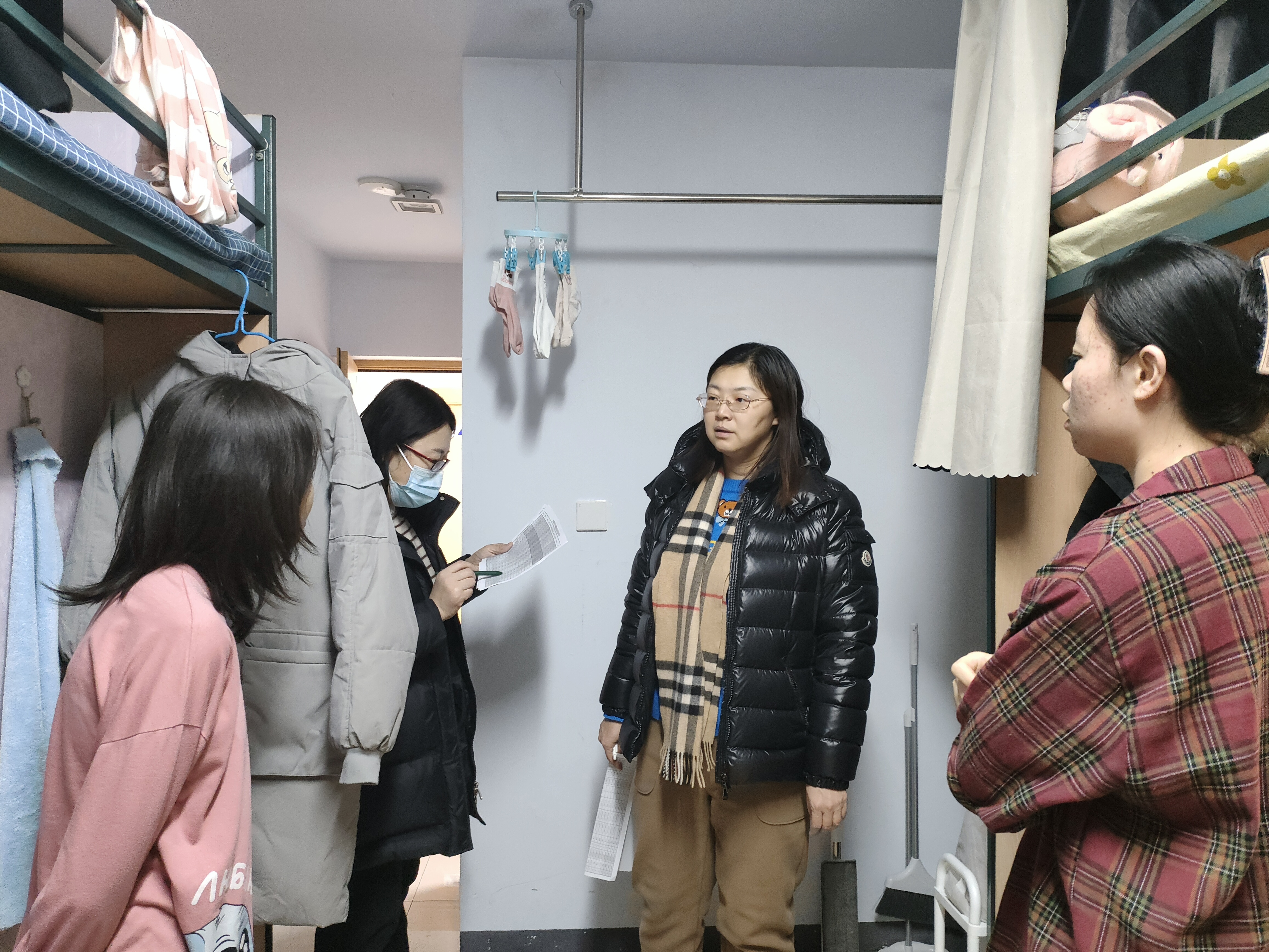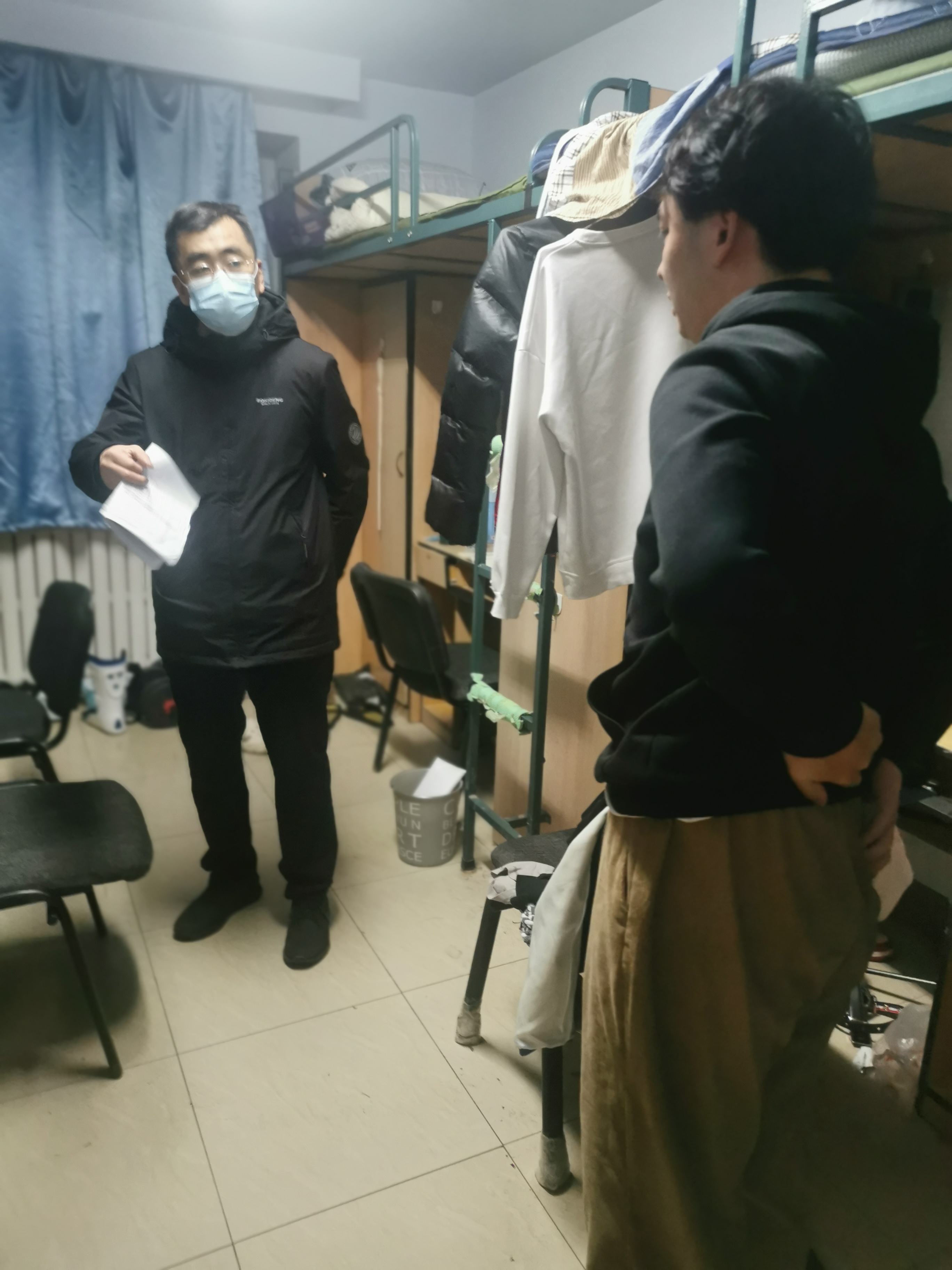 1月26日晚,韩月波、李峰、党委副书记兼副院长葛宗梅、研究生秘书、本科生辅导员,深入新民五公寓、六公寓、七公寓、十一公寓以及北区四公寓所有留校学生寝室,逐一与学生交谈慰问,了解学生生活、学习、科研、实习情况,叮嘱学生注意身体、注意安全;同时再次强调消防安全常识,要坚决杜绝违章用电,并对寝室存在的安全隐患进行排查、提醒,筑牢安全底线。