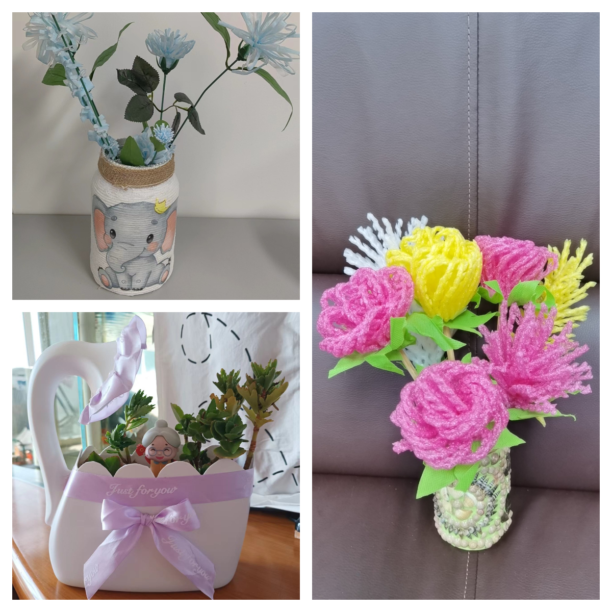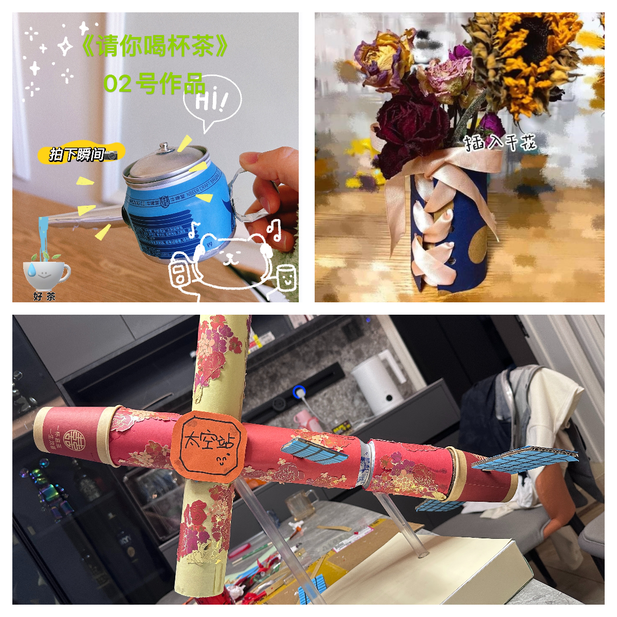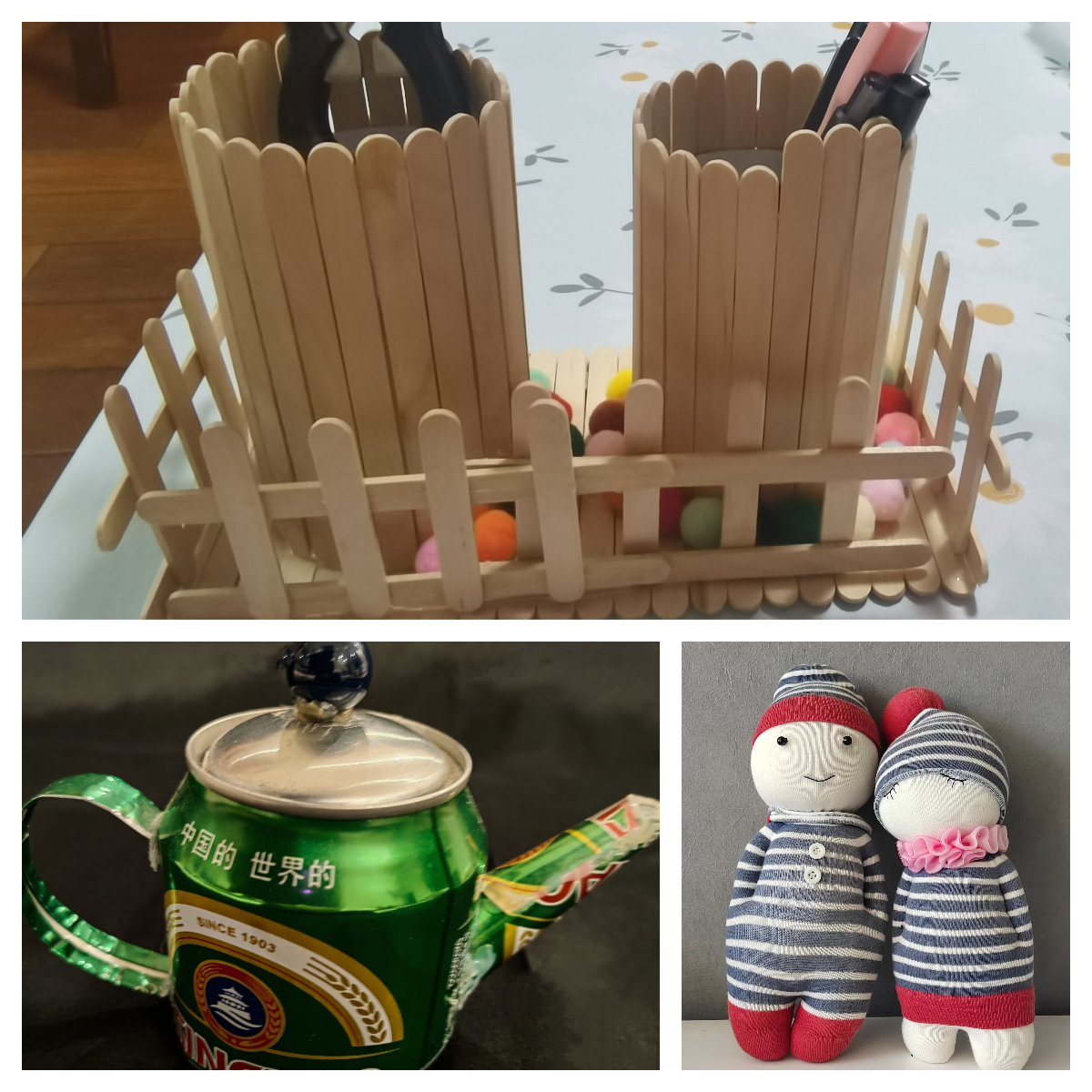 老师们用旧衣物、废纸盒、饮料瓶等家里闲置用品,巧手设计,制作成美观实用的装饰品、收纳品,将勤俭节约、环保意识、创新精神融入到作品中,并在日常工作、生活中发扬光大。