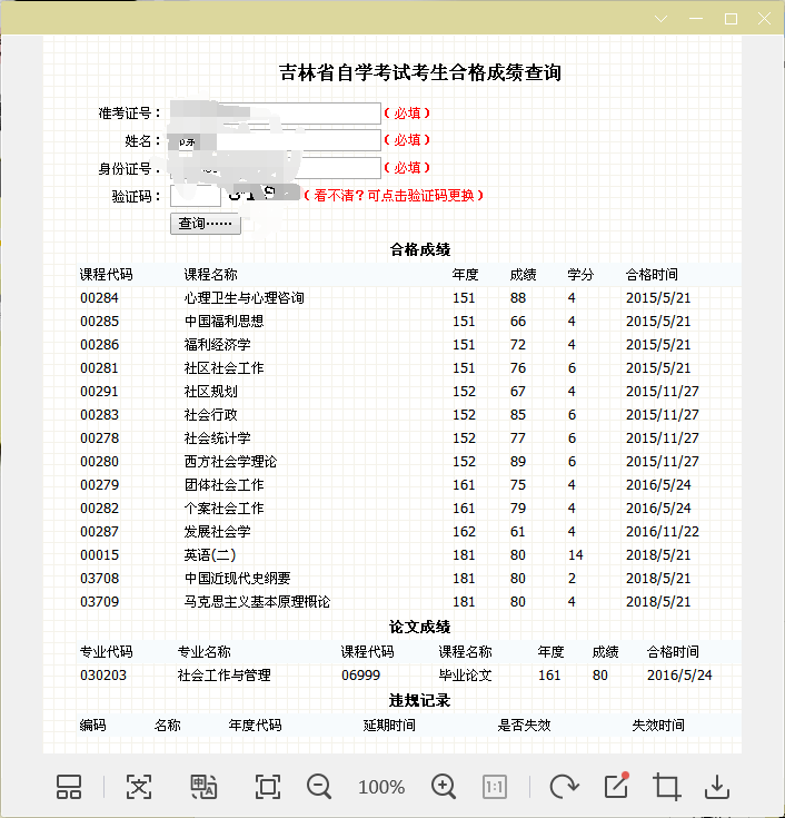 1.自学考试的学生申报时需提供:自考学位申请表,毕业证书及身份证(反正面复印在一张纸上)原件及复印件(审核后原件返还学生本人,留复印件备查),高等教育自学考试成绩单(网上打印,图例如下)。以上材料一律用A4纸提交。