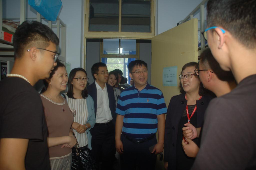 席海涛书记和陈立院长等院领导在陪同校领导走访了女生寝室后又继续走访了南苑二公寓男生寝室,并到迎新现场看望了工作人员及新生。席书记和陈院长询问了学生们的生源地情况以及报考志愿情况,得知大部分同学第一志愿填报了护理专业,院领导对他们给予了欢迎和鼓励,叮嘱同学们珍惜大学时光,努力成长成材。