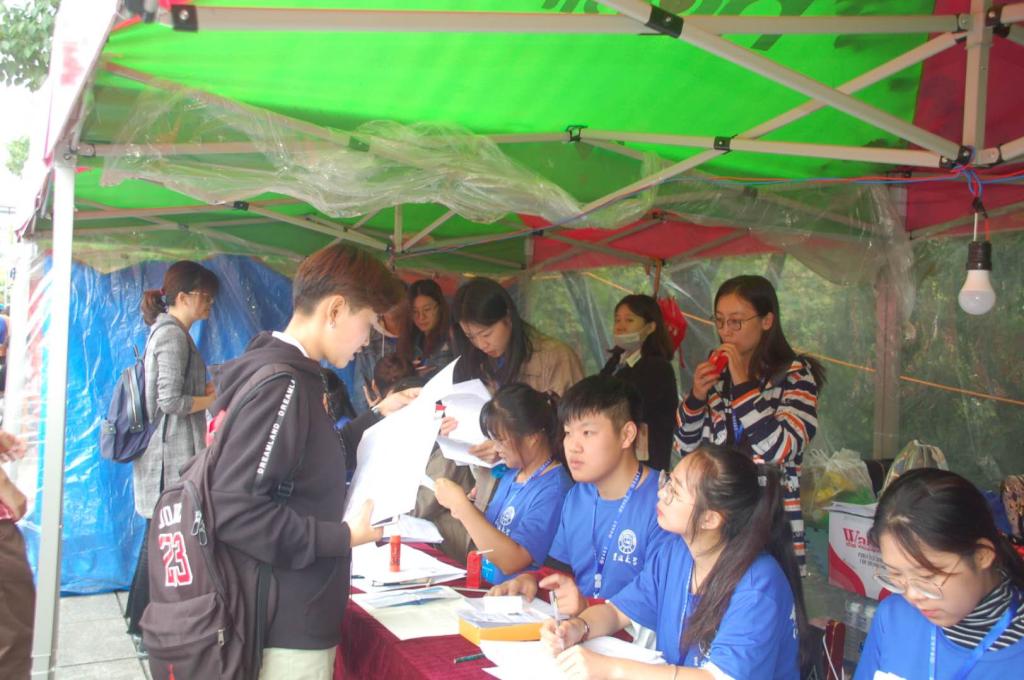 早上7点,迎新现场一切备置妥当。雨势不减,陆续到来的新生及家长们在帐篷前有秩序地排队,依次办理报到手续。包你发