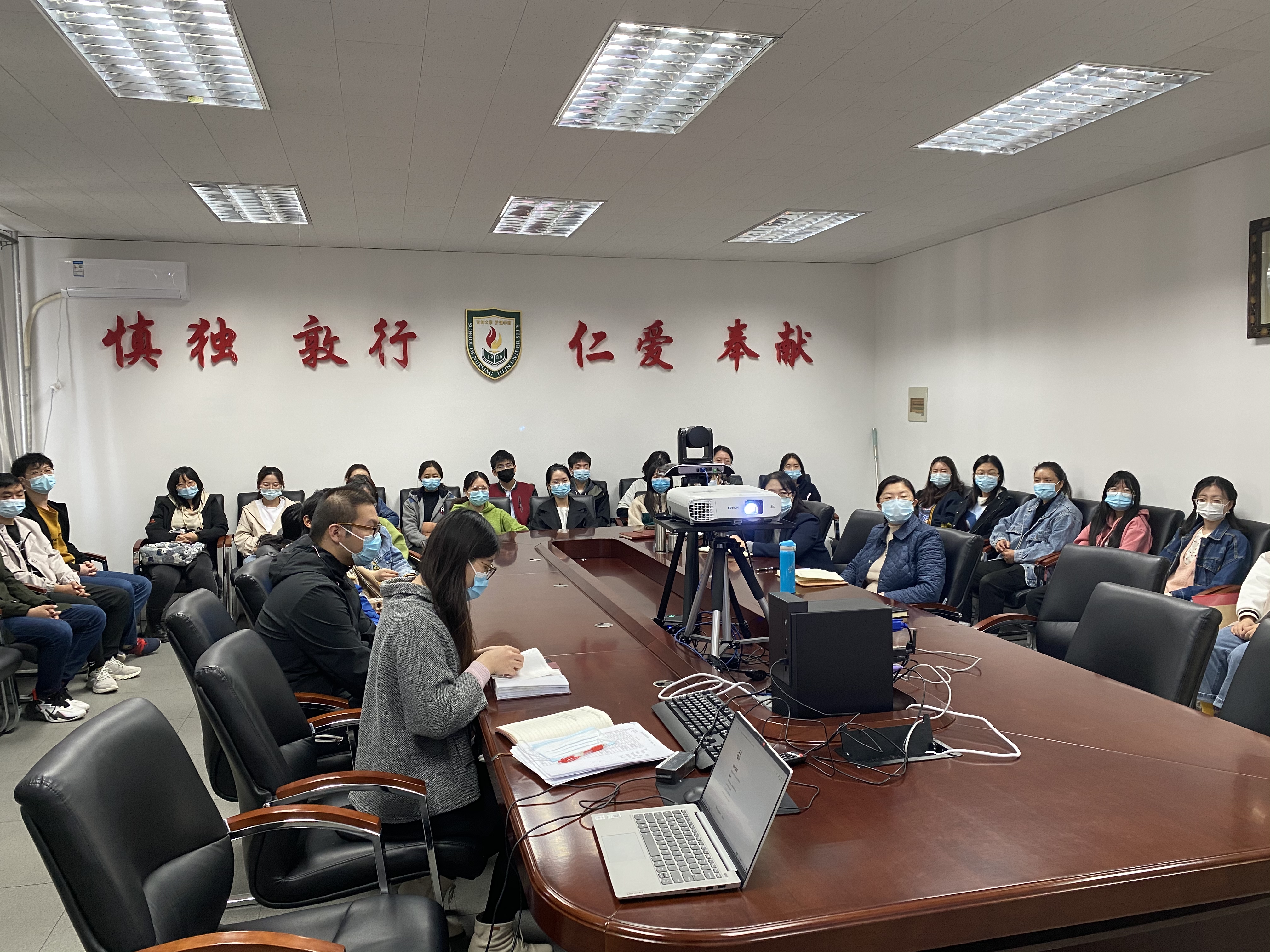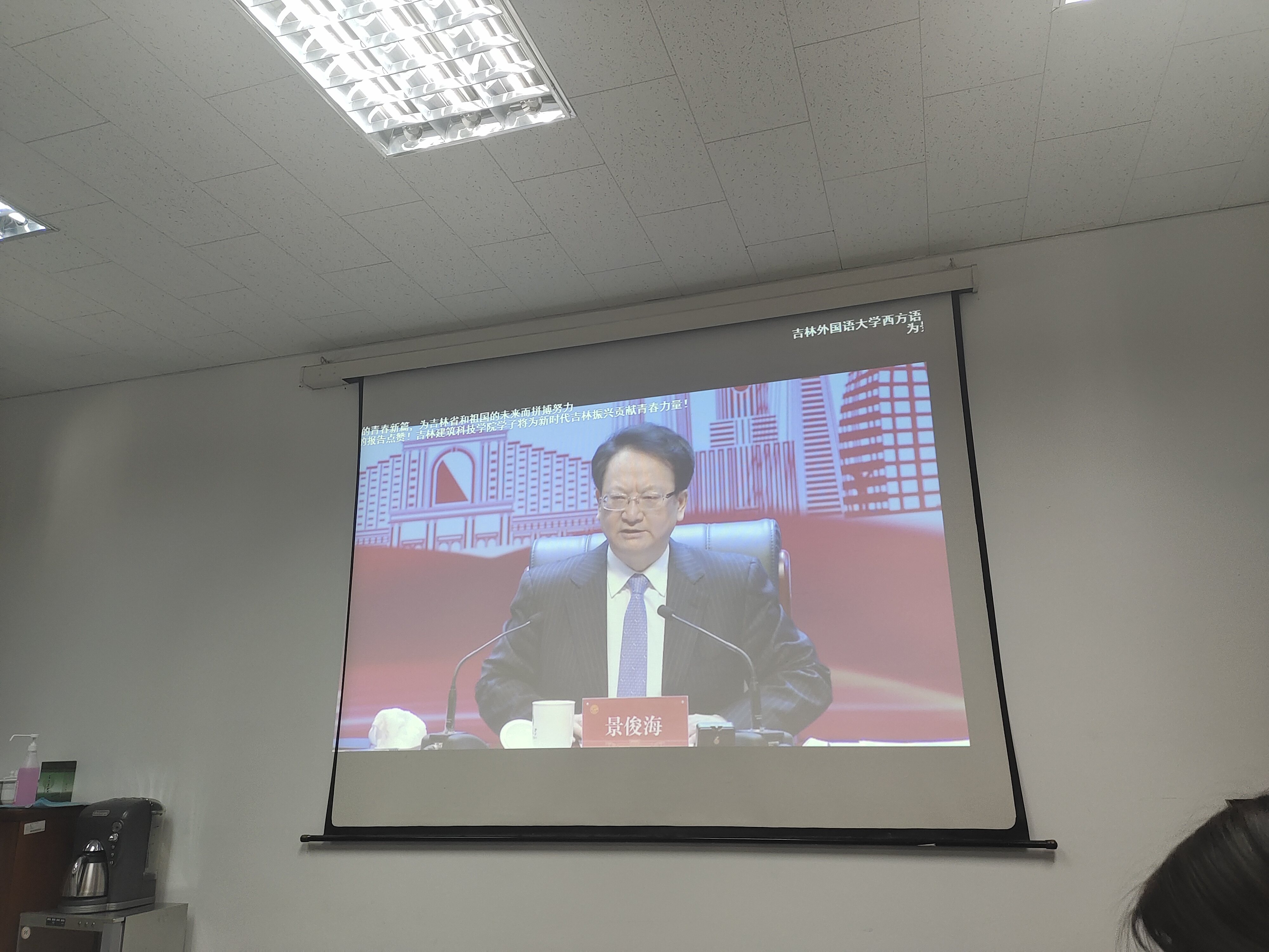 三楼会议室的分会场观看报告会的直播视频。报告会上,吉林省党委书记景俊海书记首先就习近平总书记关于振兴吉林有关精神进行了报告。景书记强调,全省人民要深入贯彻党中央决策部署,不断开创吉林各项事业发展新局面,在新时代吉林振兴中实现新突破、创造新业绩。作为新时代大学生,要勇于担当,勇于奋斗,勤奋学习,在新起点面前做具有责任意识和创新精神的建设者。