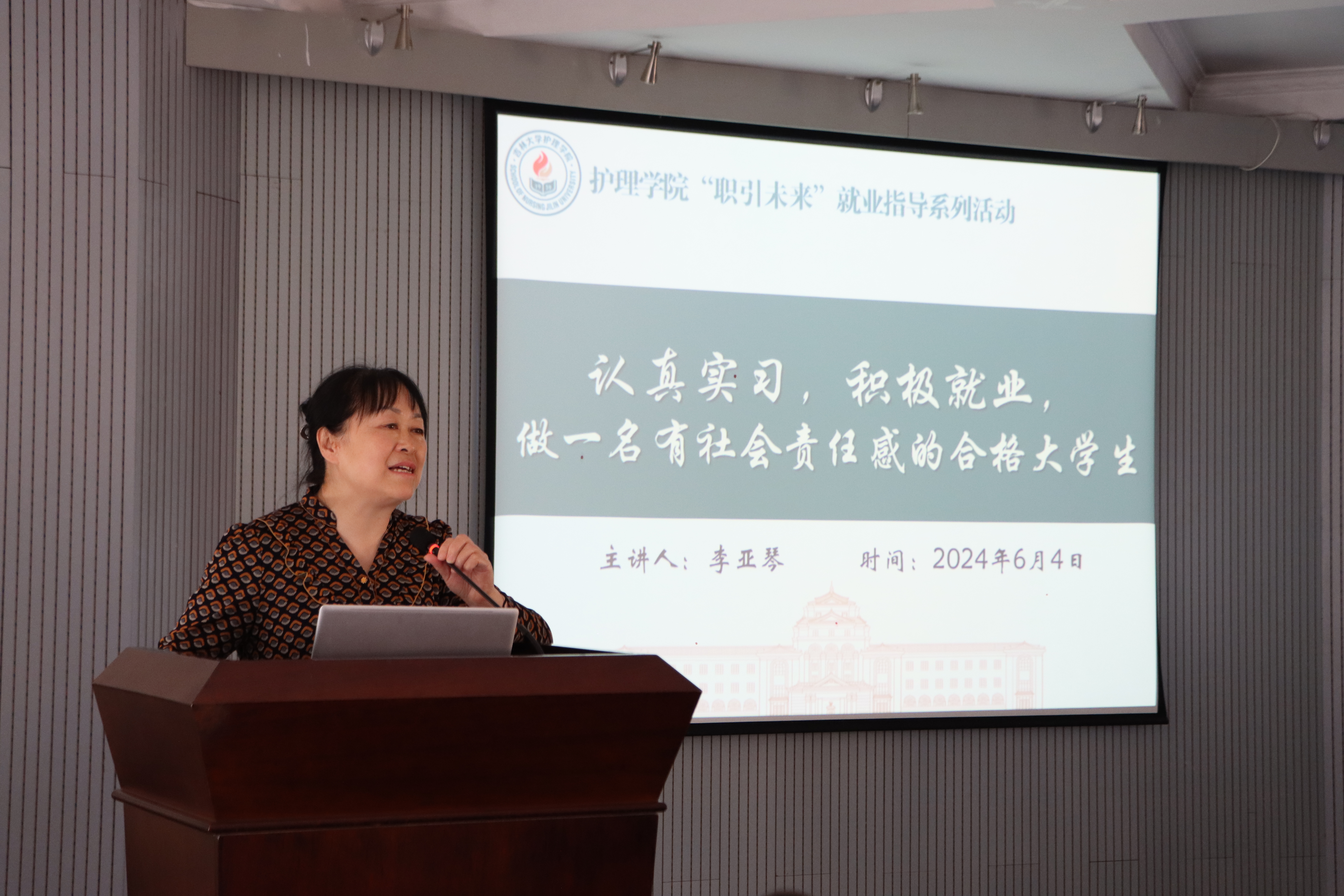 本次讲座,李亚琴老师以“认真实习,积极就业,做一名有社会责任感的合格大学生”为主题,围绕实习与就业为学生分享毕业生经历和经验,给予引导和指导。她首先回顾了自己的职业生涯,强调了临床教学实习对于学生是积累知识财富、锻炼实践技能的关键时期,能够为未来的工作打下坚实的基础。她提醒学生在实习过程中要克服学习环境变化带来的挑战,要处理好与带教老师、与患者之间的关系。并通过一系列真实的案例教育学生要加强职业修养、做好职业保护、规避职业风险、保持专业精神。要牢记“慎独、敦行、仁爱、奉献”的院训,毫不利己专门利人,对患者极端负责,对同志极端热忱,对技术精益求精,做白求恩精神的传人。