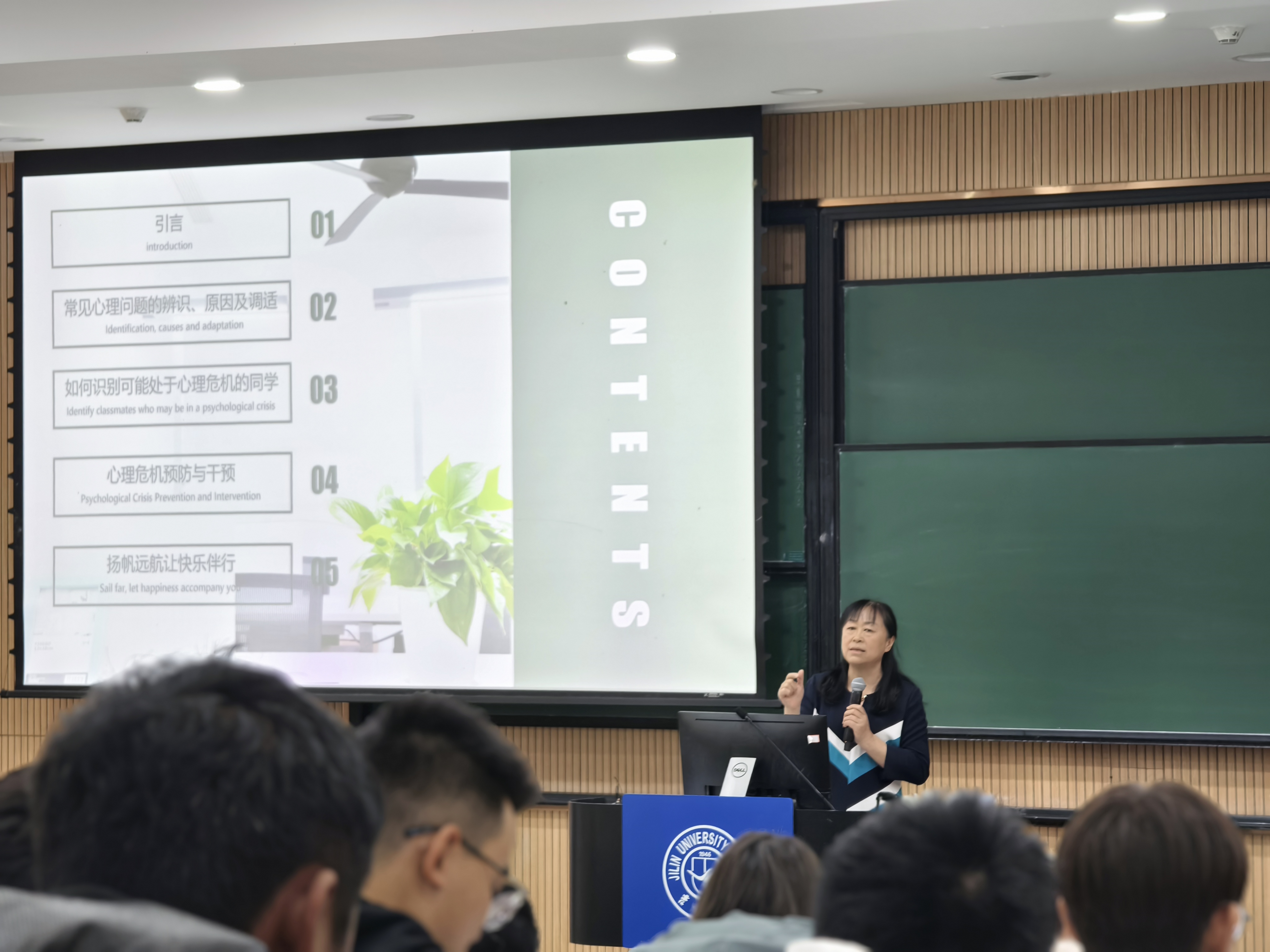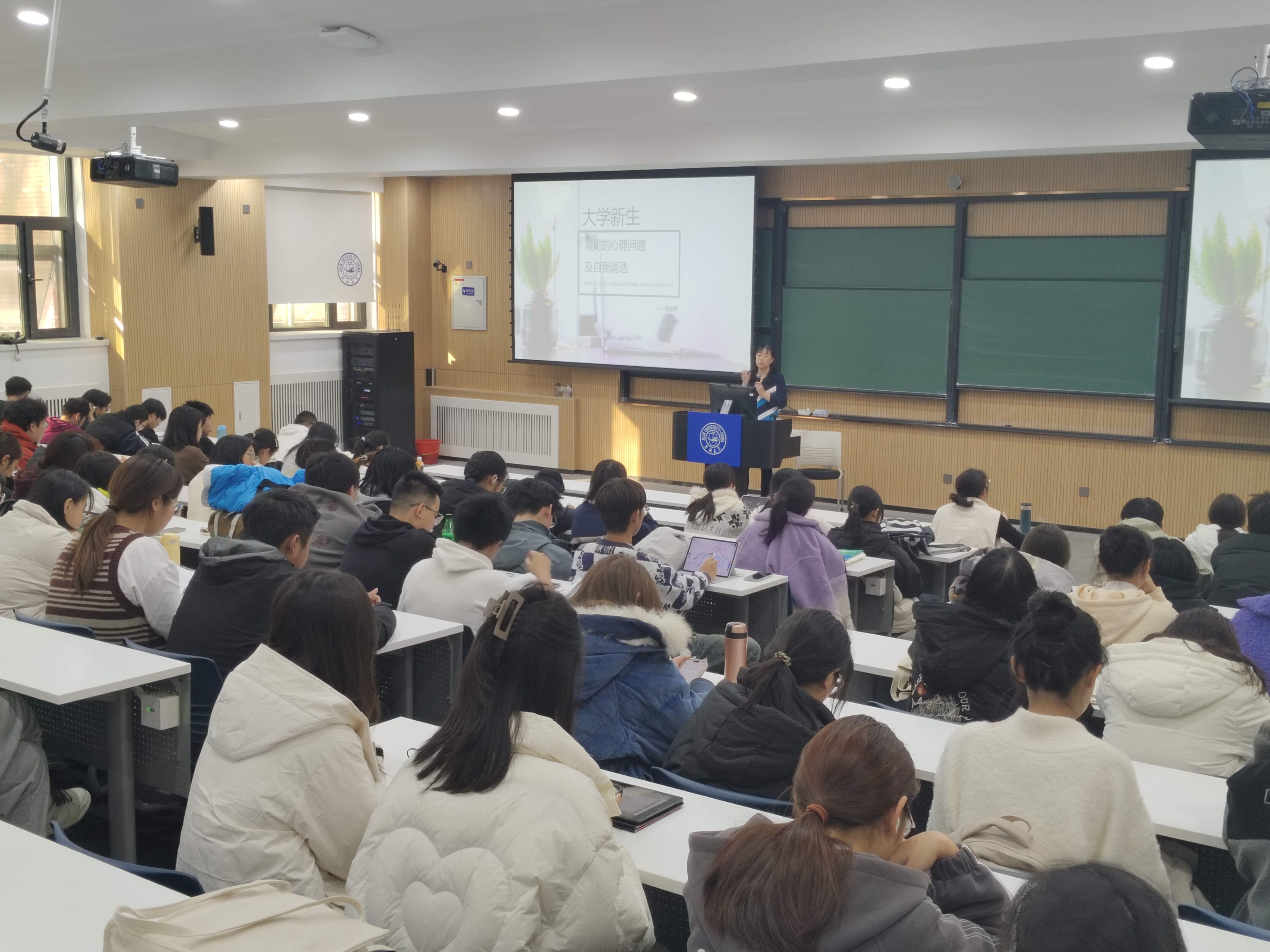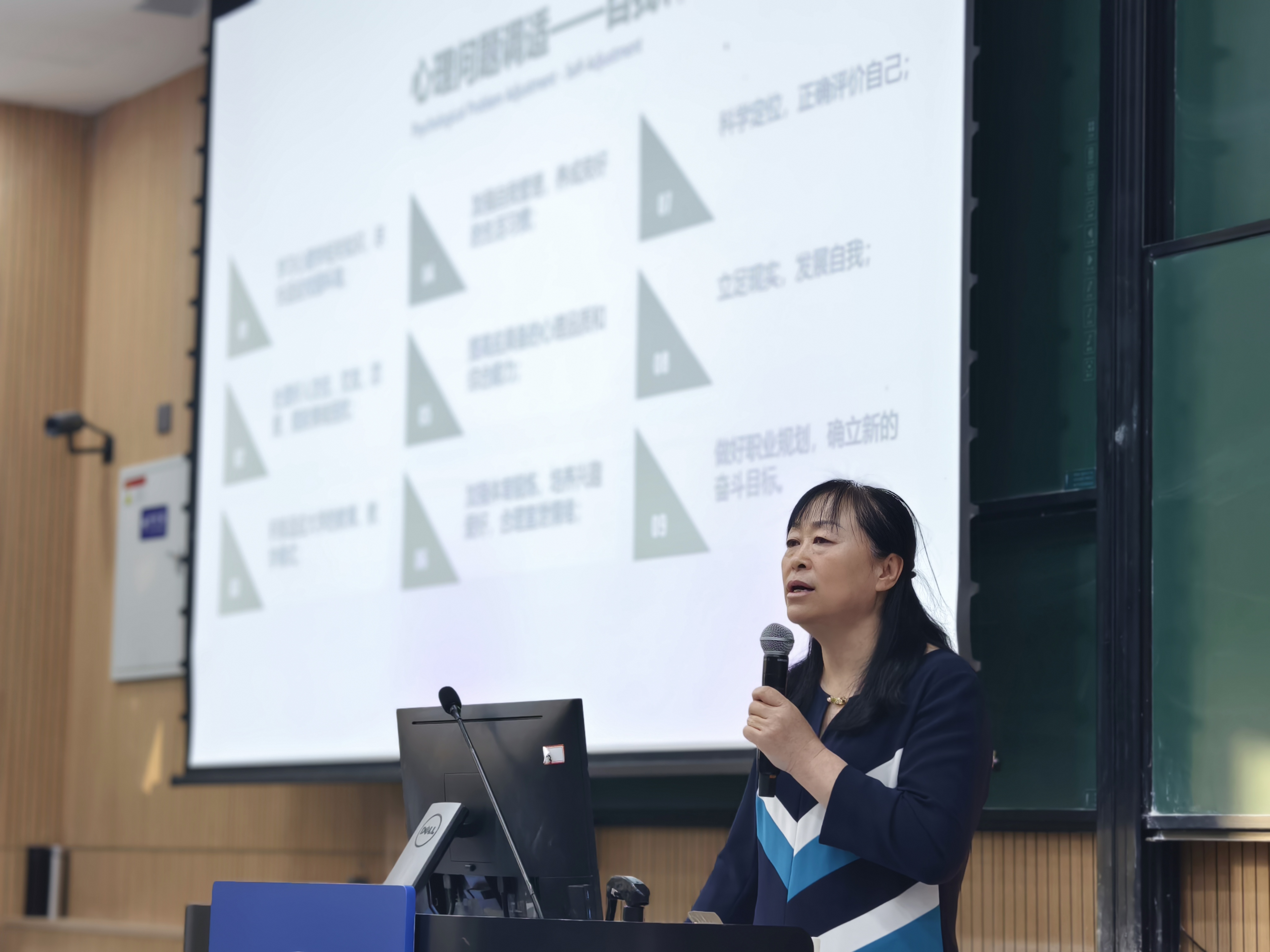 的学生连在一起。同学们纷纷为之动容。随后,她深入浅出地讲解了心理健康相关知识,包括心理健康的定义、大学生心理健康的标准、如何保持学习兴趣、如何协调情绪、如何保持人际关系和谐等。